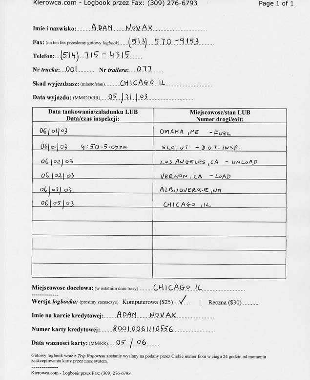 Usługi >> Logbooki >> Logbook przez Fax >> Logbook przez Internet >> Przepisy Prosimy wydrukować i dokładnie wypełnić Formularz przez Fax opisujący Twoją trasę, a następnie wysłać go na poniższy numer faxu: ____________________________________________________________________________________ |